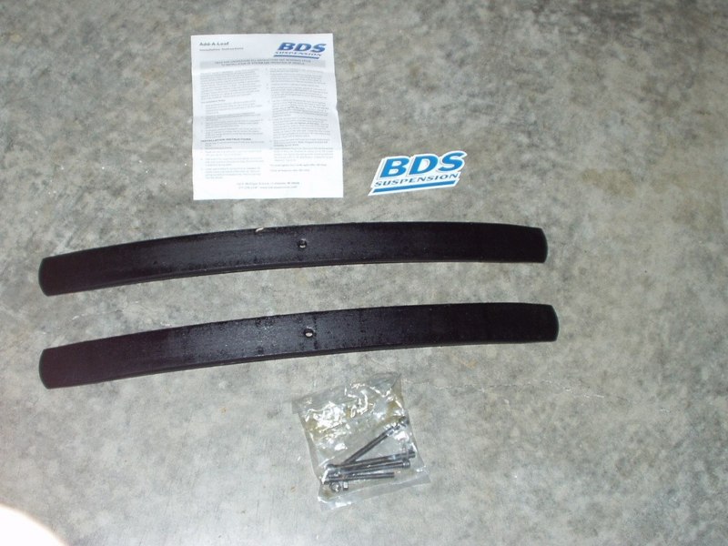 This is the add-a-leaf kit I used from BDS off road products. The whole kit cost $60 and included all the parts needed to install the new leafs into the main leaf packs.