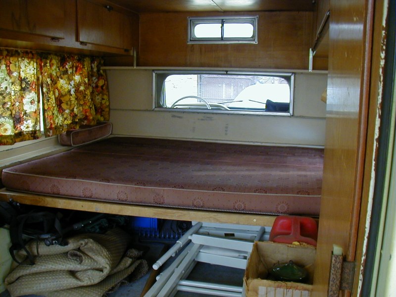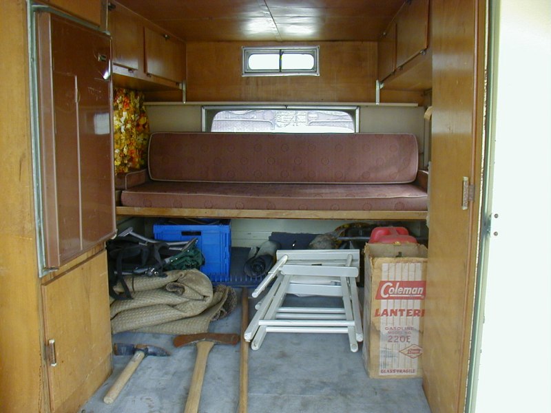 was the cabinets by the rear end of the camper, allowing access to them while outside of the truck. In the original Pullman, it also had a cooler on the driver's side by the tailgate, making access to your chilled food fairly easy. Besides the rear cabinets you also have overhead cabinets running along both sides of the camper, giving you even more space for your belongings, while leaving room for the folding bed that made into a bench seat.