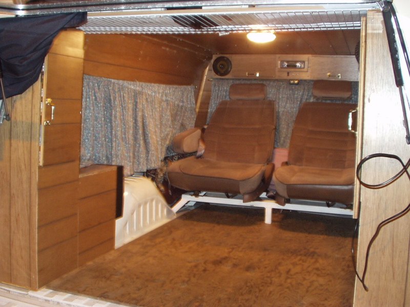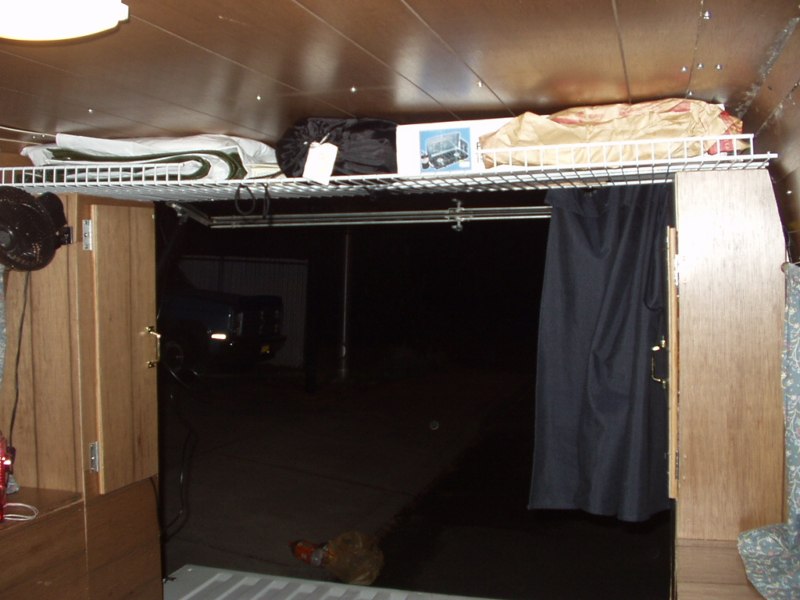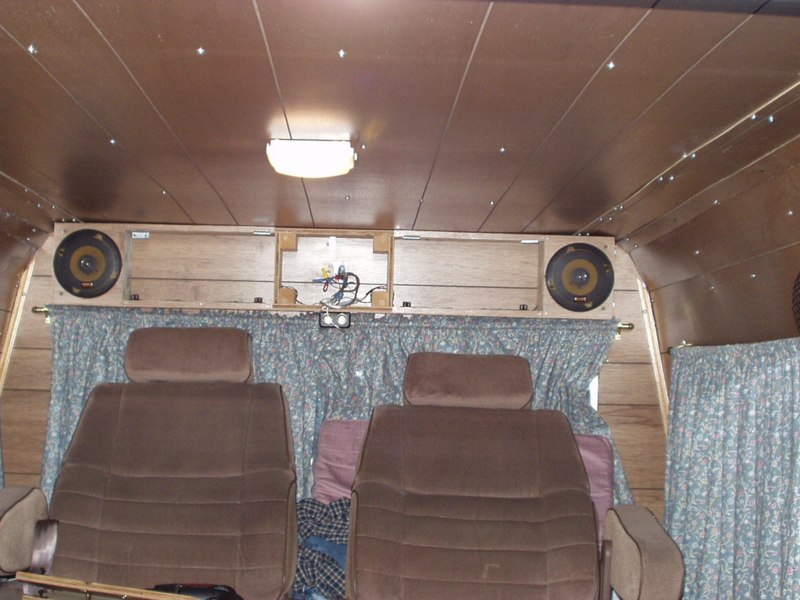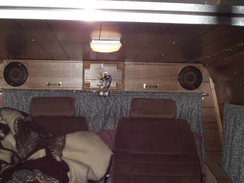 I decided on building two hi/lo cabinets to take advantage of the walls space and the available wasted floor space, and an overhead cabinet/console for storing books, tapes, cds, and the small hand-held CB for contacting the driver with. The overhead doubles as the mount for the rear stereo system and the main wiring junction box for everything in back.