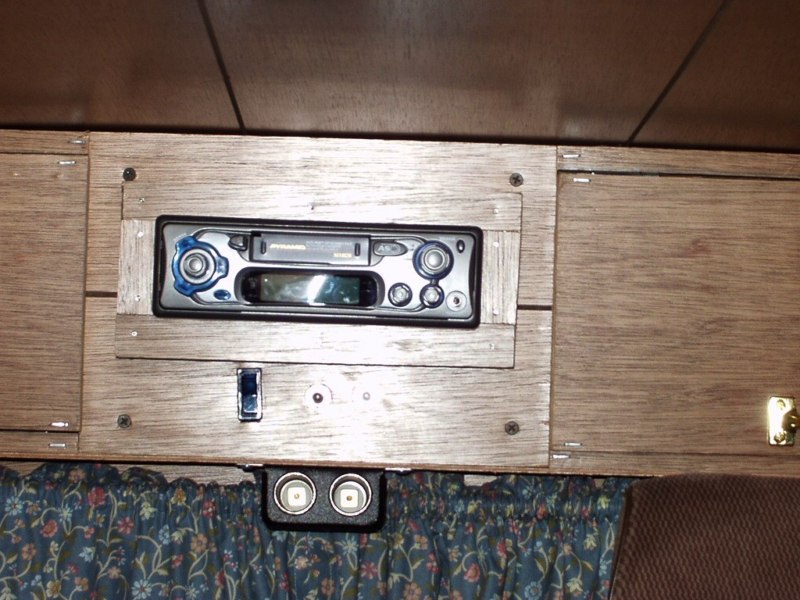 The blue toggle in the picture on the left below the stereo is meant for the electric heater that will eventually go in the back, there will likely be a subject in the projects section later on about its installation. After one camping trip with 20 degree nights, it was decided that a SAFE way to heat the back a bit (Not all Night) was needed. At the time this was built, the heater was a "maybe" item, and was wired for as such. The other item installed on the cabinet is in the center, hanging just below it. I found at my local Bi-Mart a two receptacle plug for around $5 that simply needed to be wired in and screwed in place. It came with an in-line fuse for the outlets, so that any devices plugged in are protected. It works great for running things like a CD-player, cell-phone charger or other low amperage device. High amperage 12 volt items still use the side outlets, as the wiring for the dual outlet will not supply enough current to run them.
