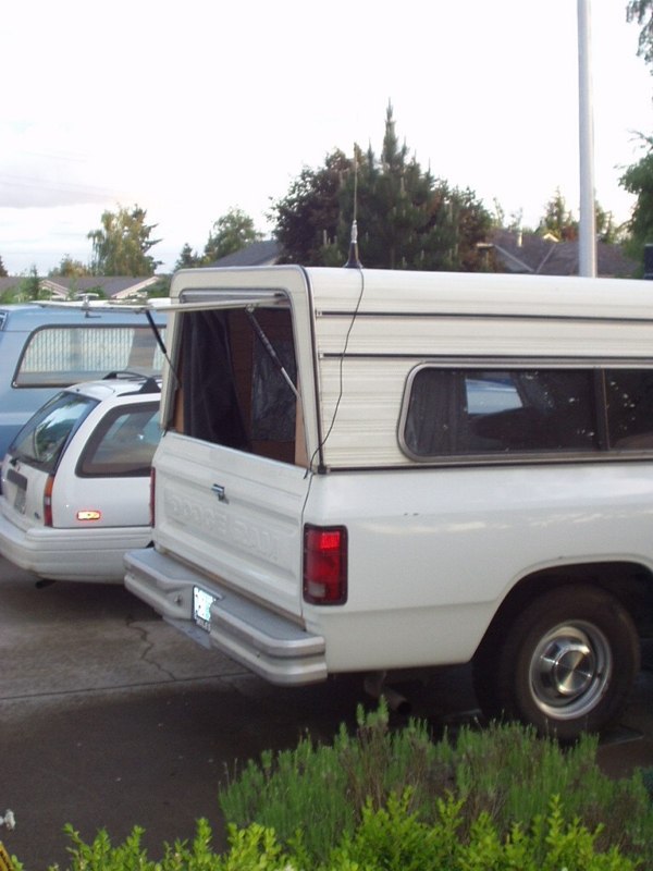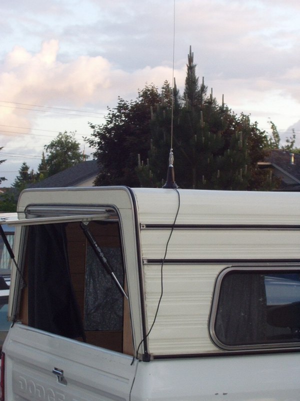 When at camp, I simply have to open the cabinet, pull out the antenna and base, unwind the cord from the cabient and place it on the roof (or ground, depending on clearance) and get the TV out. To keep the antenna from blowing off the roof or all over the ground, I carry along a piece of scrap plate steel and just stick the magnet base to it before positioning. The nice thing about the CB antenna is that the TV can be used going down the road without worry of it being knocked off. I just stick it to the bumper and it stays put, the benefit of the old trucks having a steel bumper.