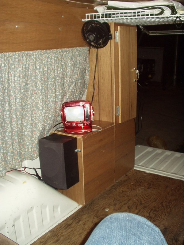 Once the TV was finished, I mounted my nice 12 volt occilating fan to the side of the right-side cabinet (Looking In). I picked it up some time back at our local truck stop for about $10. It originally didn't have an on/off switch, so I installed a cheap roll switch so I didn't have to plug and unplug the unit when I needed it. It puts out a lot of air movement for its size, but doesn't pull a lot of power. Some day I will actually get my brother's multi-meter out there and see how many amps it draws, I just know it got ran for about 20 hours on a camping trip to Diamond Lake and hardly drained the battery, but kept me and my lady nice and frosty cool in the 90 degree weather.