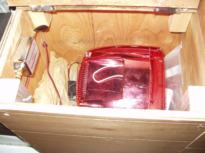 One was the old magnet mount CB antenna. On my truck, I have a REAL cb antenna, a nice Firestik II, so the old cheap magnet one became another piece of junk piled in the tool shed. I also had my TV signal booster and my little b/w TV sitting around. So I finally got to work and put the two in. I cut off the original CB screw on on the antenna and attached a standard Cable screw on plug in its place. I then fished the wiring for the line for the TV, the old antenna line and 12 volt cord for the TV and booster into the inside of the passenger side rear cabinet and permanently installed them.